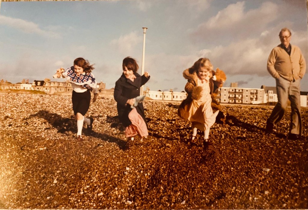 With Grandpa and her sisters at Littlehampton Beach